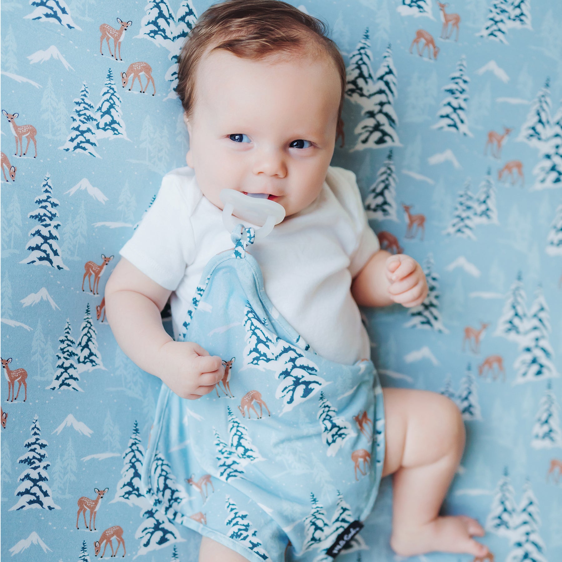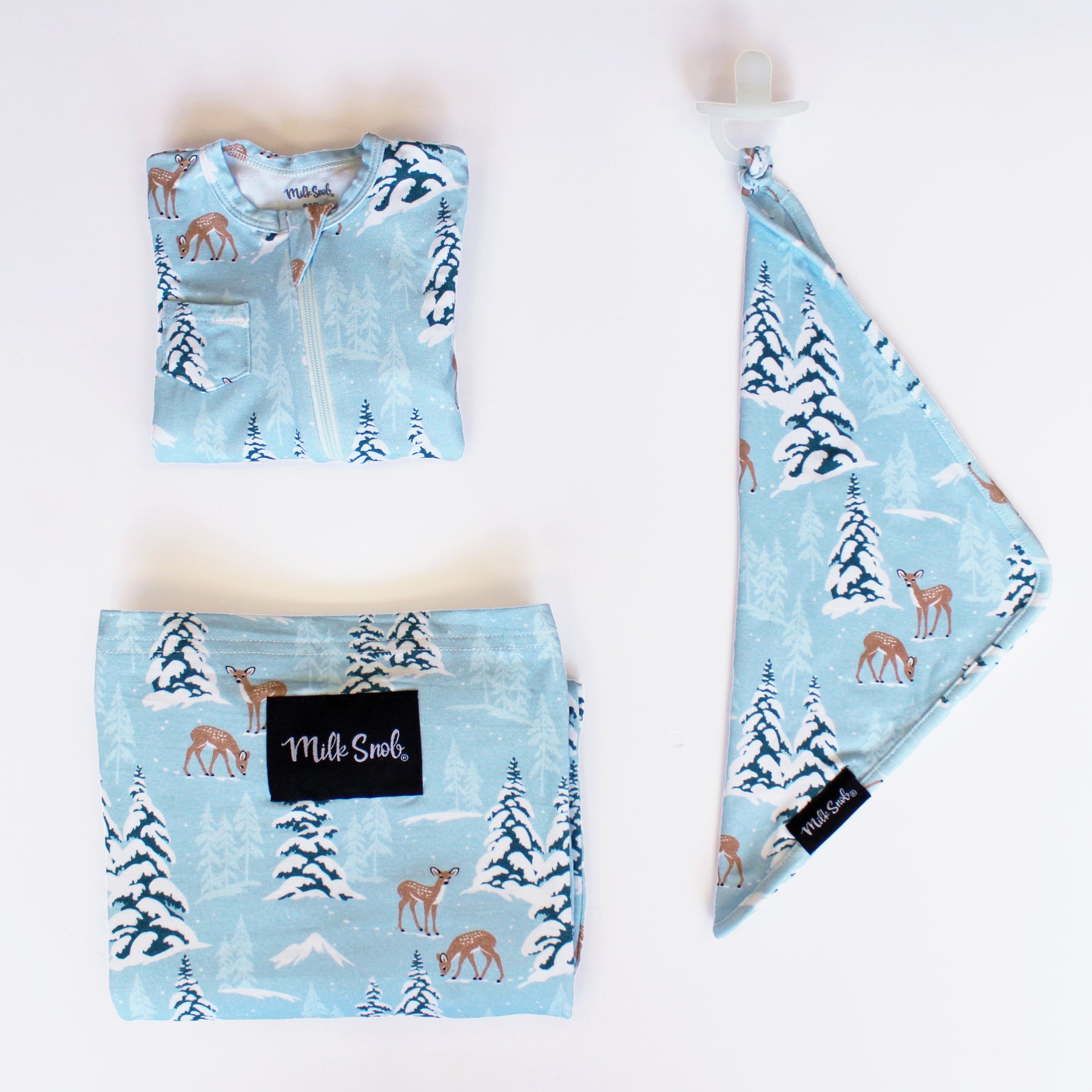 Welcome your baby into the world with the Alpine Welcome Baby Gift Box! This box includes all the essentials for a newborn, beautifully packaged for gifting. This design features winter trees and adorable deer on a soft blue background.