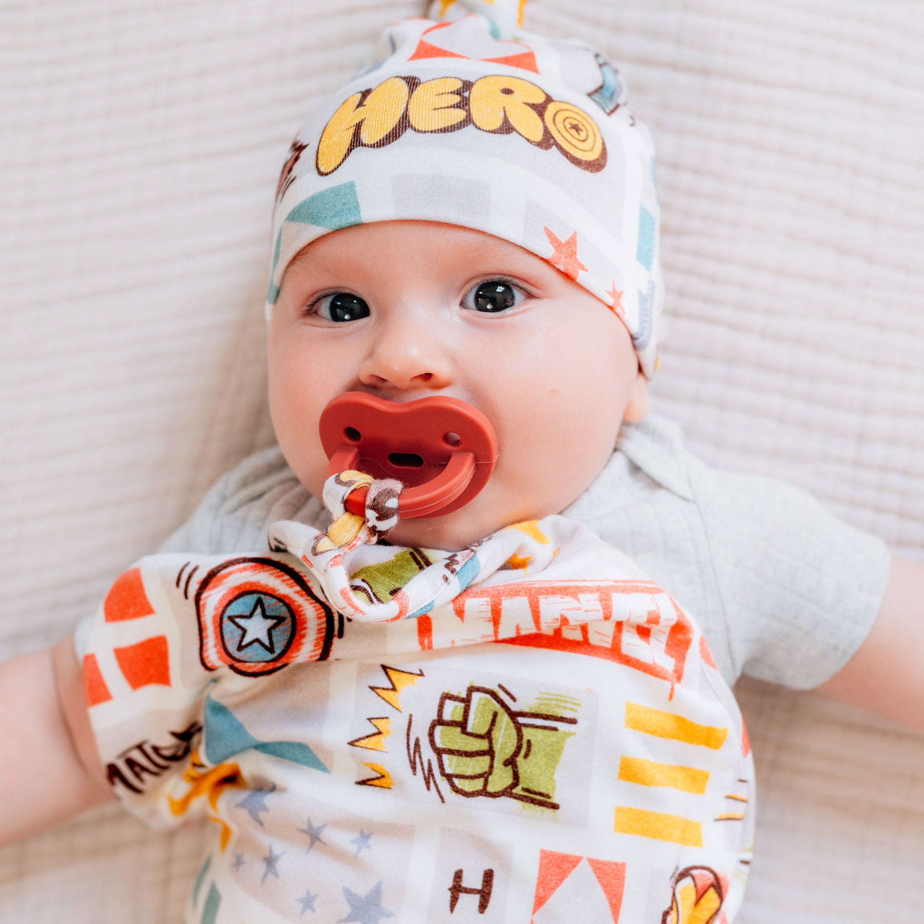 Cuddle up with Milk Snob's adorable Marvel World knotted hat. As one of the first items you'll use to keep your newborn warm, our hats are a stylish staple that will keep your baby cozy in any climate.