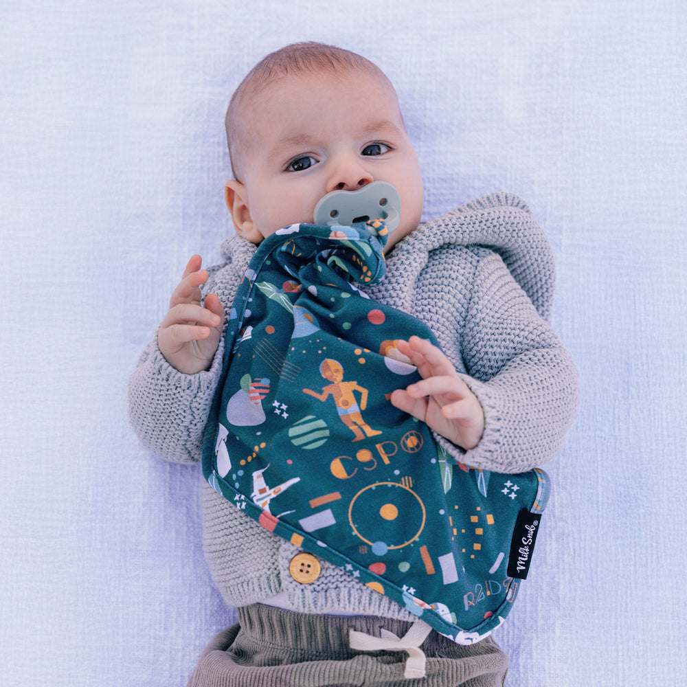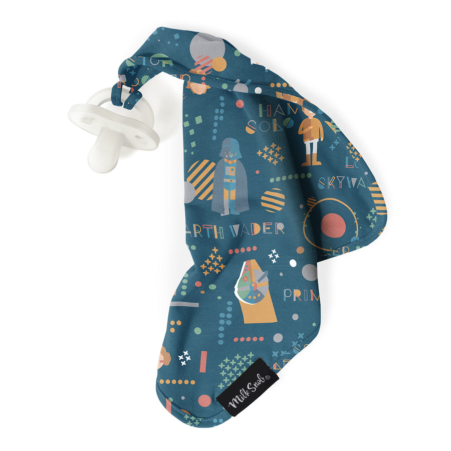 The STAR WARS Hyperspace Milk Snob® Lovey is a mini security blanket, designed to make babies feel comforted. Attach it to a pacifier, teether, or other toy. Pacifier not included.