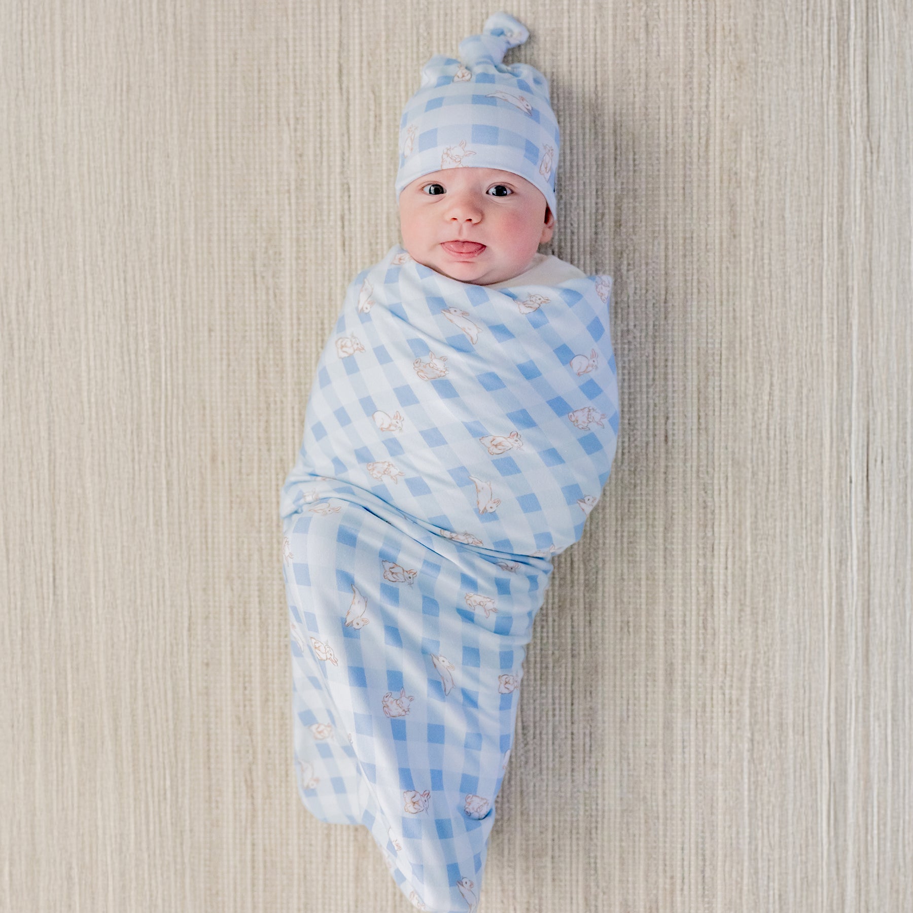 Cuddle up with Milk Snob's adorable knotted hats. As one of the first items you'll use to keep your newborn warm, our Cottontail hat is a stylish staple that will keep your baby cozy in any climate. This design features cute bunnys hopping across a soft blue gingham background.