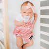 The Daisy Milk Snob® Lovey is a mini security blanket, designed to make babies feel comforted. Attach it to a pacifier, teether, or other toy. This design features dainty white flowers on a pink background. Pacifier not included.