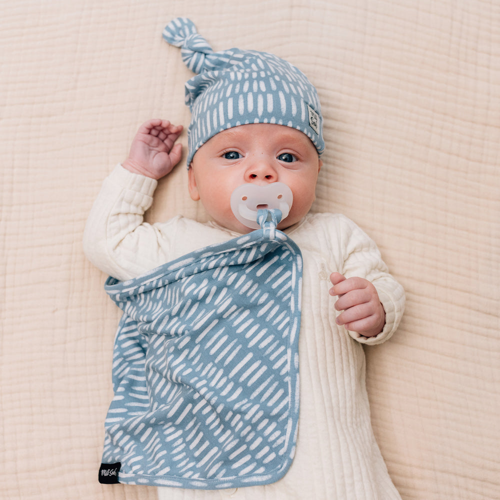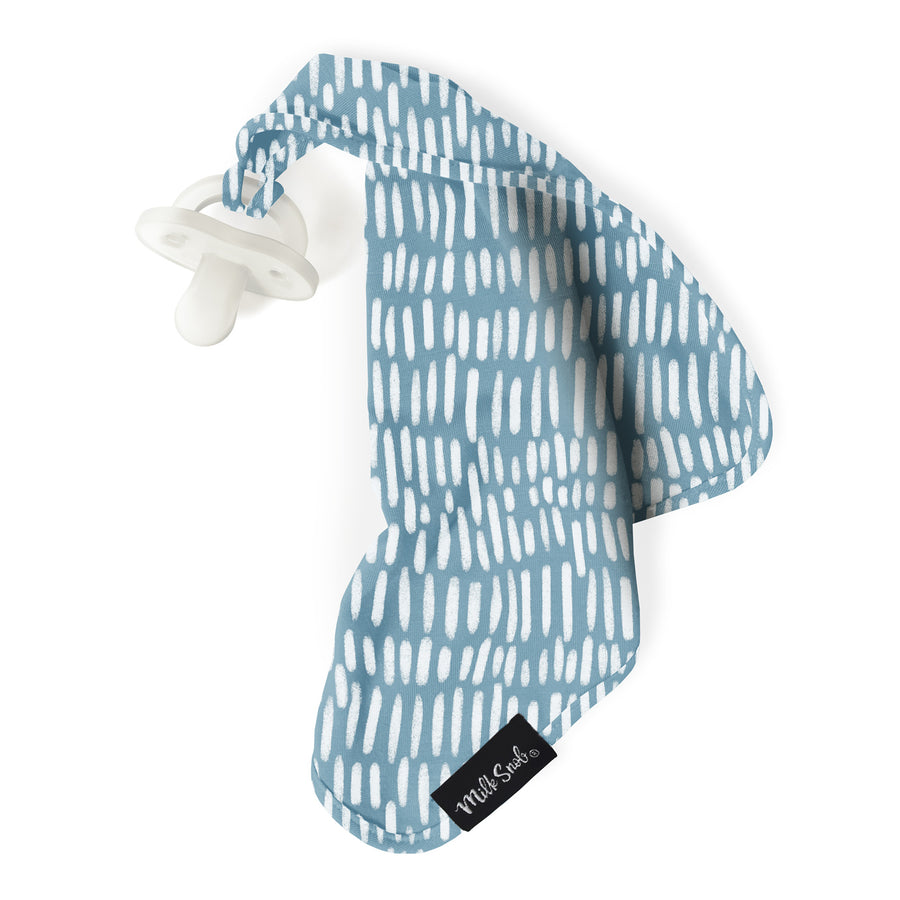 The Beck Milk Snob® Lovey is a mini security blanket, designed to make babies feel comforted. Attach it to a pacifier, teether, or other toy. Pacifier not included. This design features a geometric pattern with an soft blue background.