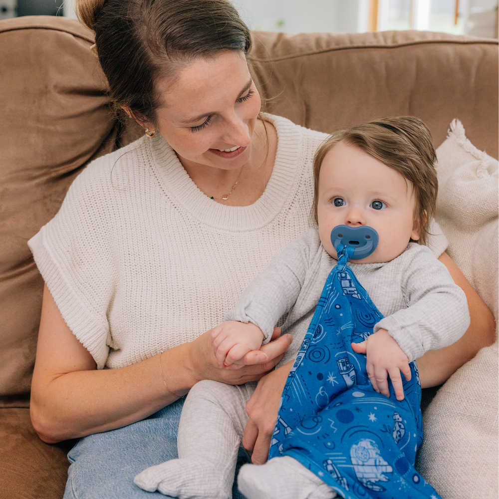 The Star Wars™ Daring Droids Milk Snob® Lovey is a mini security blanket, designed to make babies feel comforted. Attach it to a pacifier, teether, or other toy. Pacifier not included.