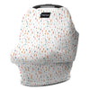 The original Quinn 5-in-1 Milk Snob® Cover is a breathable multifunctional cover that can be used as a baby car seat cover, nursing cover, shopping cart cover, high chair cover, infant swing cover and more. This design features colorful geometric shapes on a white background.