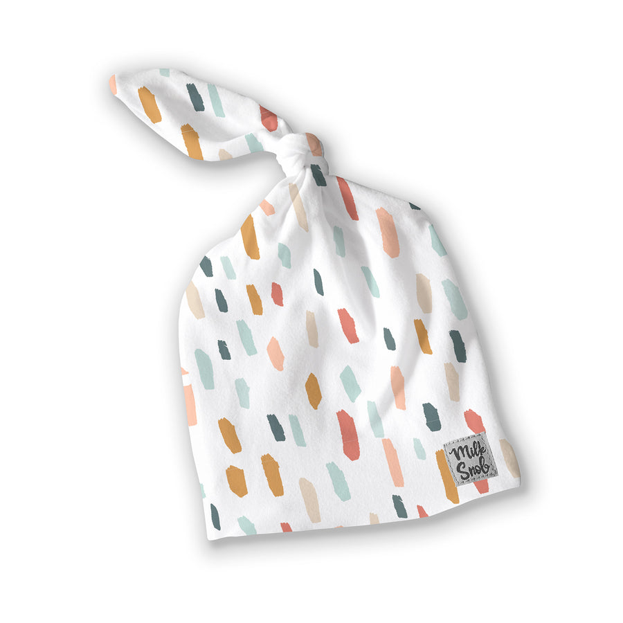 Cuddle up with Milk Snob's adorable Quinn knotted hat. As one of the first items you'll use to keep your newborn warm, our Quinn hat is a stylish staple that will keep your baby cozy in any climate. This design features colorful geometric shapes on a white background.