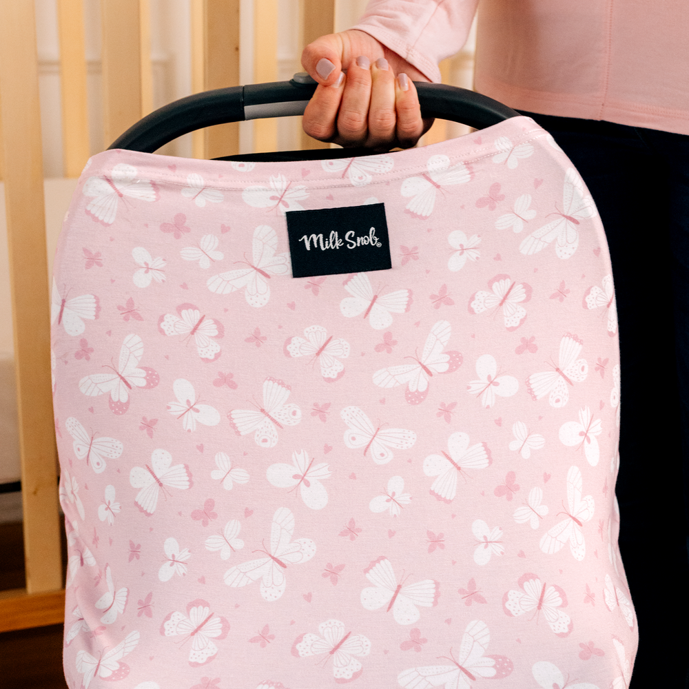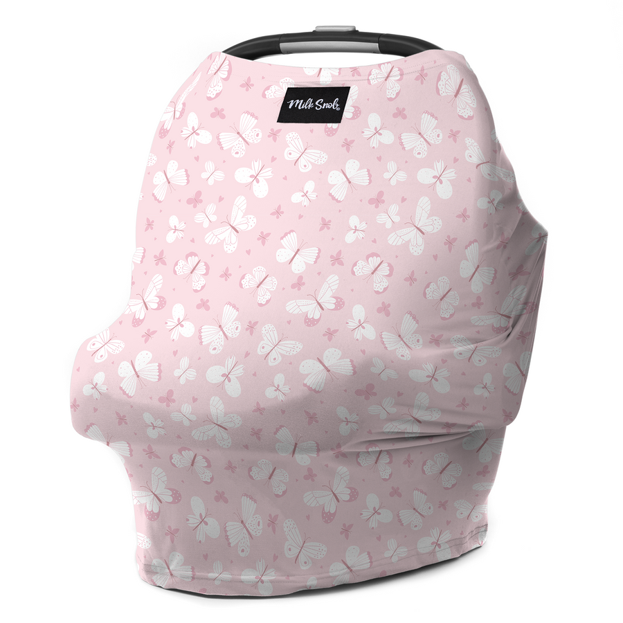 The original Sophie 5-in-1 Milk Snob® Cover is a breathable multifunctional cover that can be used as a baby car seat cover, nursing cover, shopping cart cover, high chair cover, infant swing cover and more. This design dainty butterflies on a soft pink background.