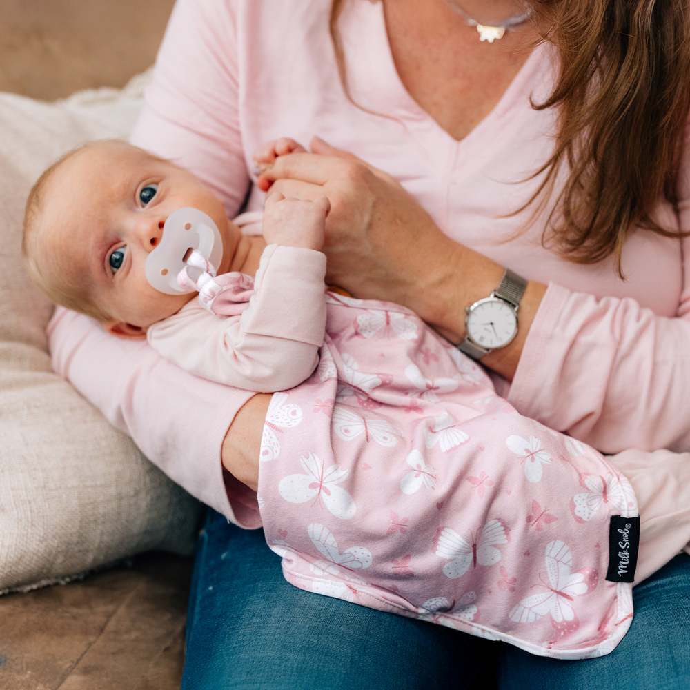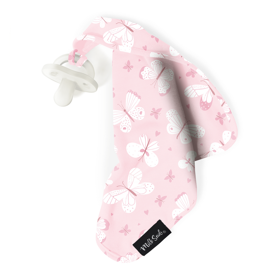 The Sophie Milk Snob® Lovey is a mini security blanket, designed to make babies feel comforted. Attach it to a pacifier, teether, or other toy. This design dainty butterflies on a soft pink background. Pacifier not included.