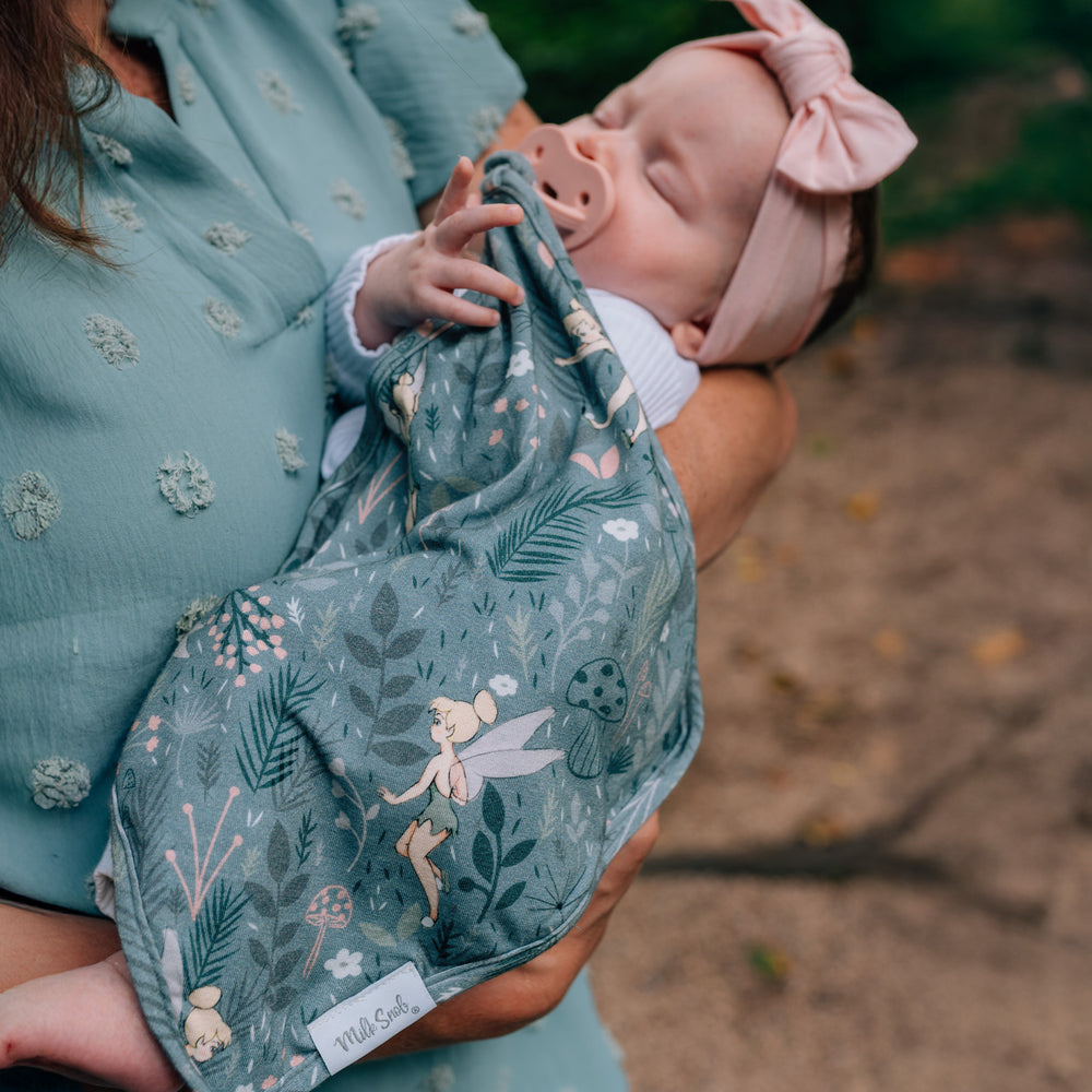 The Disney Tinker Bell Milk Snob® Lovey is a mini security blanket, designed to make babies feel comforted. Attach it to a pacifier, teether, or other toy. Pacifier not included.