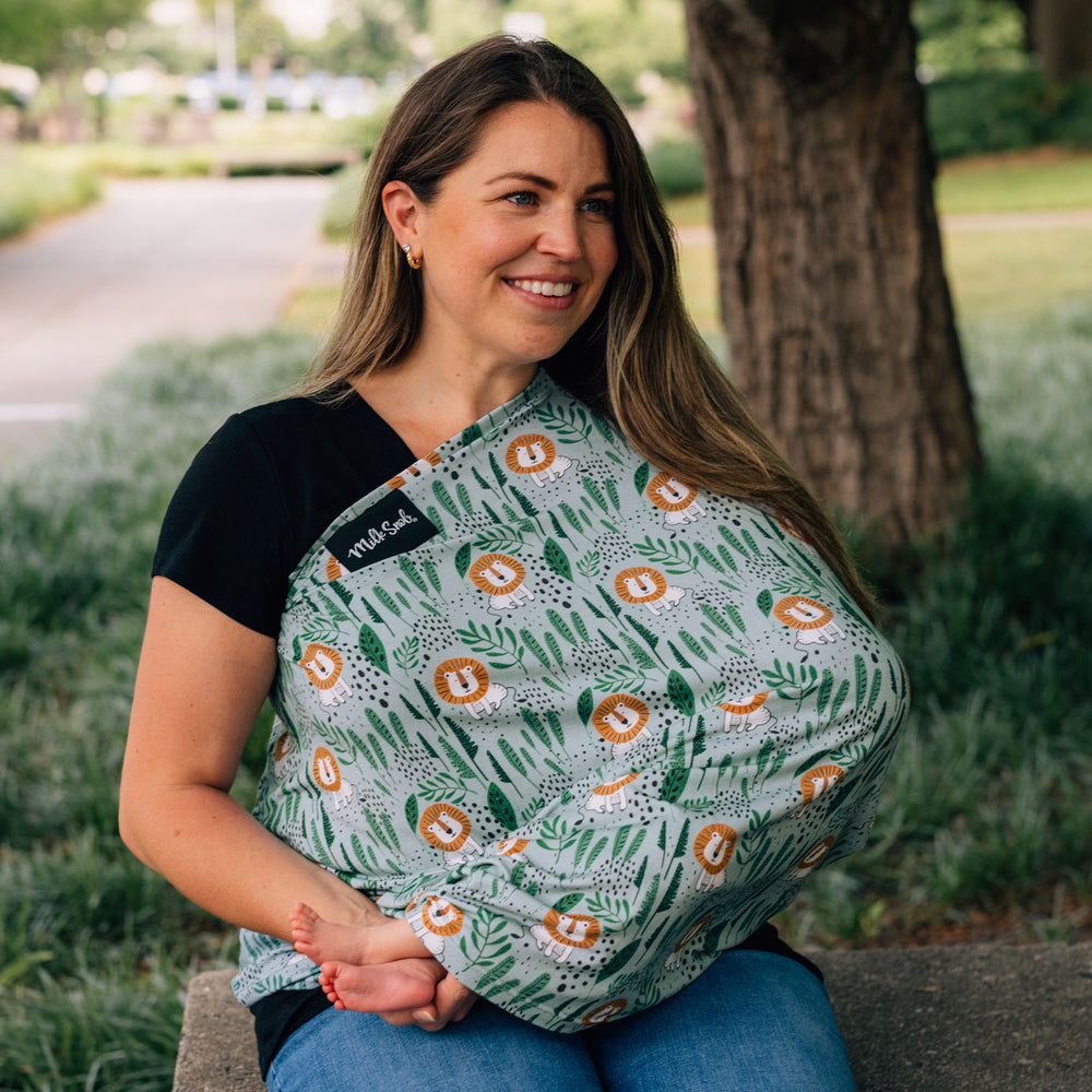 The original Leo 5-in-1 Milk Snob® Cover is a breathable multifunctional cover that can be used as a baby car seat cover, nursing cover, shopping cart cover, high chair cover, infant swing cover and more. This design features sweet lions with a soft sage green background.