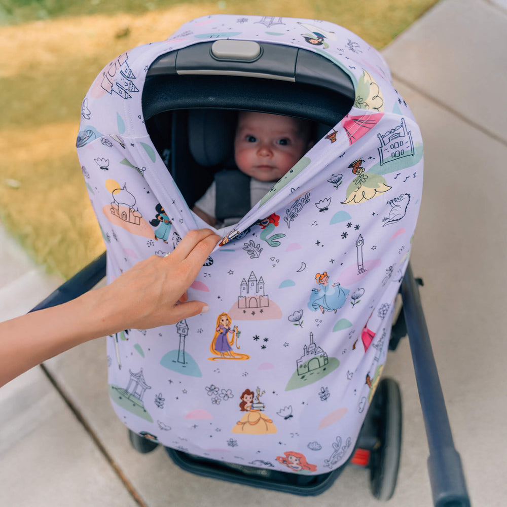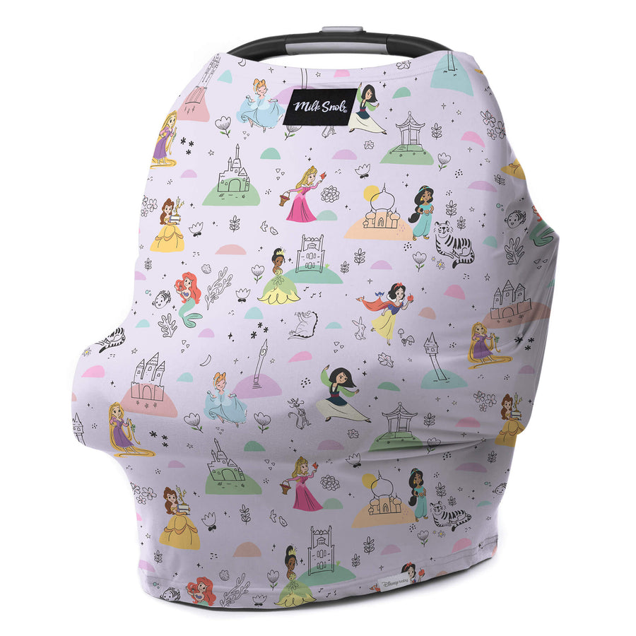 The original Disney Princess Party 5-in-1 Milk Snob® Cover is a breathable multifunctional cover that can be used for car seats, nursing, shopping carts, high chairs, infant swings, and more.