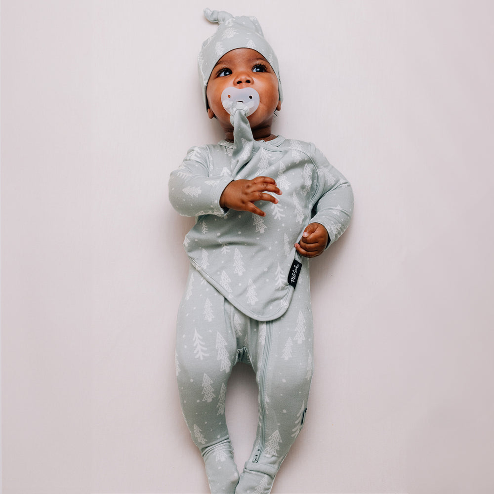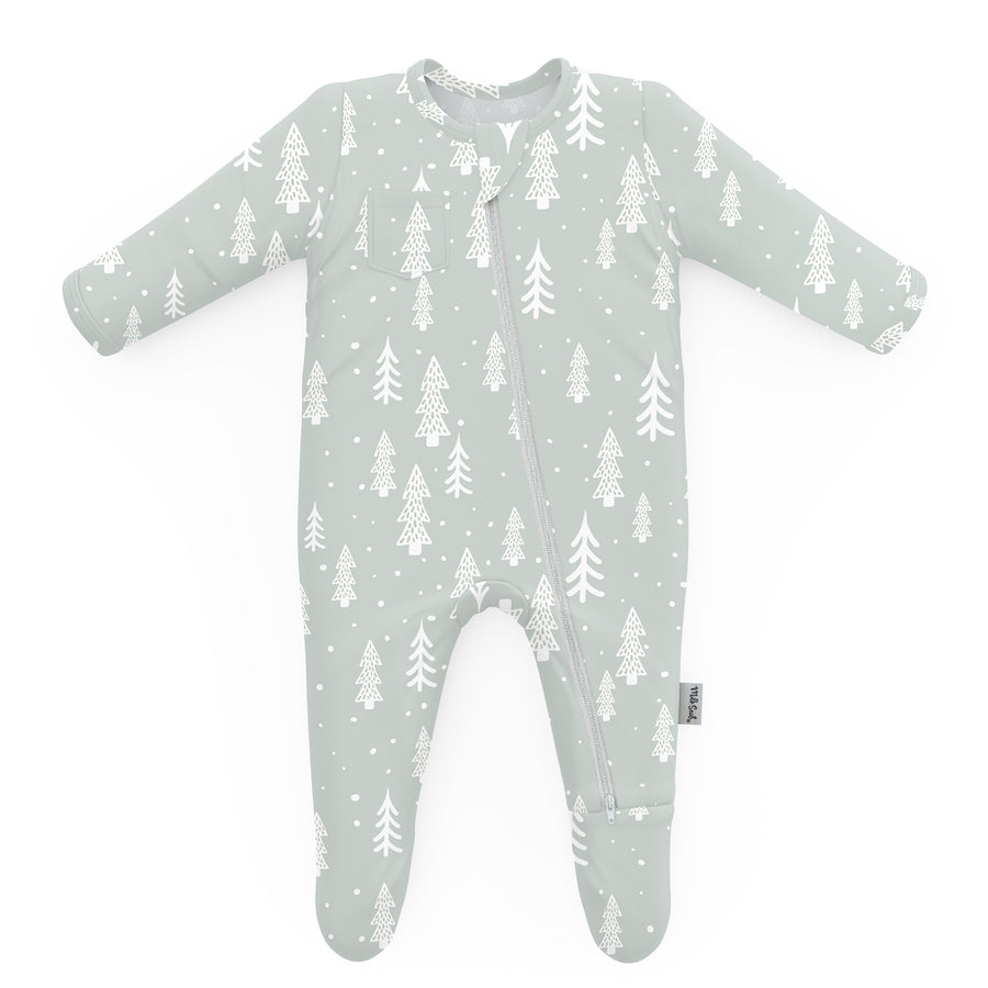 The Aspen Milk Snob® footed pajamas are slightly stretchy to grow with your baby, lightweight, breathable, and are perfect for any season. This design features white trees and speckles on a cool grey background.