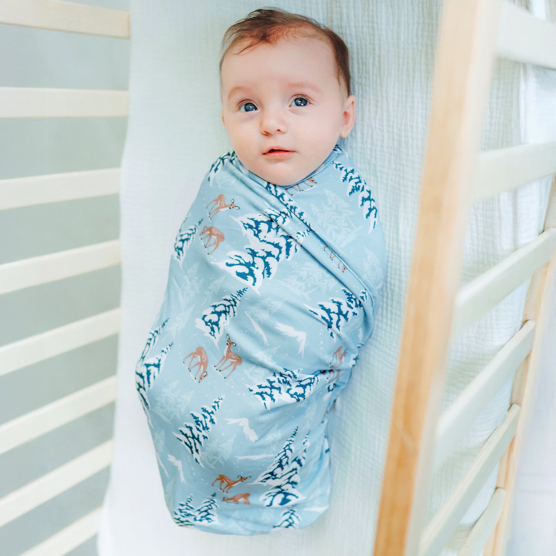 The Alpine Milk Snob® Blanket offers the perfect mix of style and comfort. Our premium rayon-blend fabric is soft, snuggly, and the dual-layer design provides the perfect weight for any climate. This design features winter trees and adorable deer on a soft blue background.