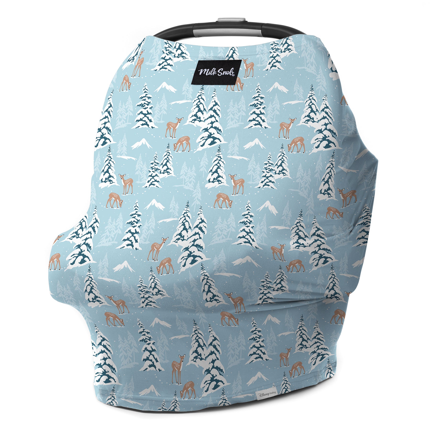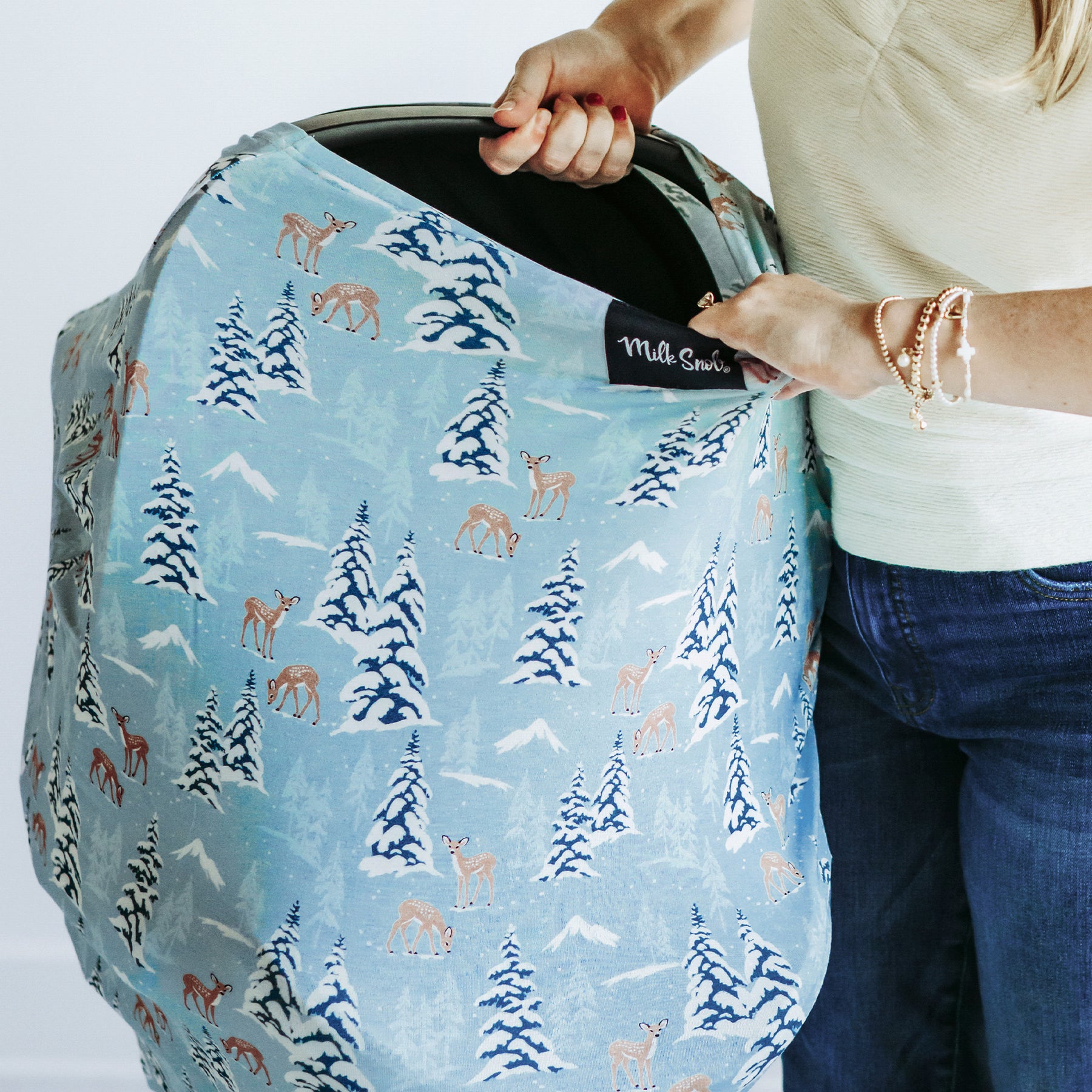 The original Alpine 5-in-1 Milk Snob® Cover is a breathable multifunctional cover that can be used as a baby car seat cover, nursing cover, shopping cart cover, high chair cover, infant swing cover and more. This design features winter trees and adorable deer on a soft blue background.