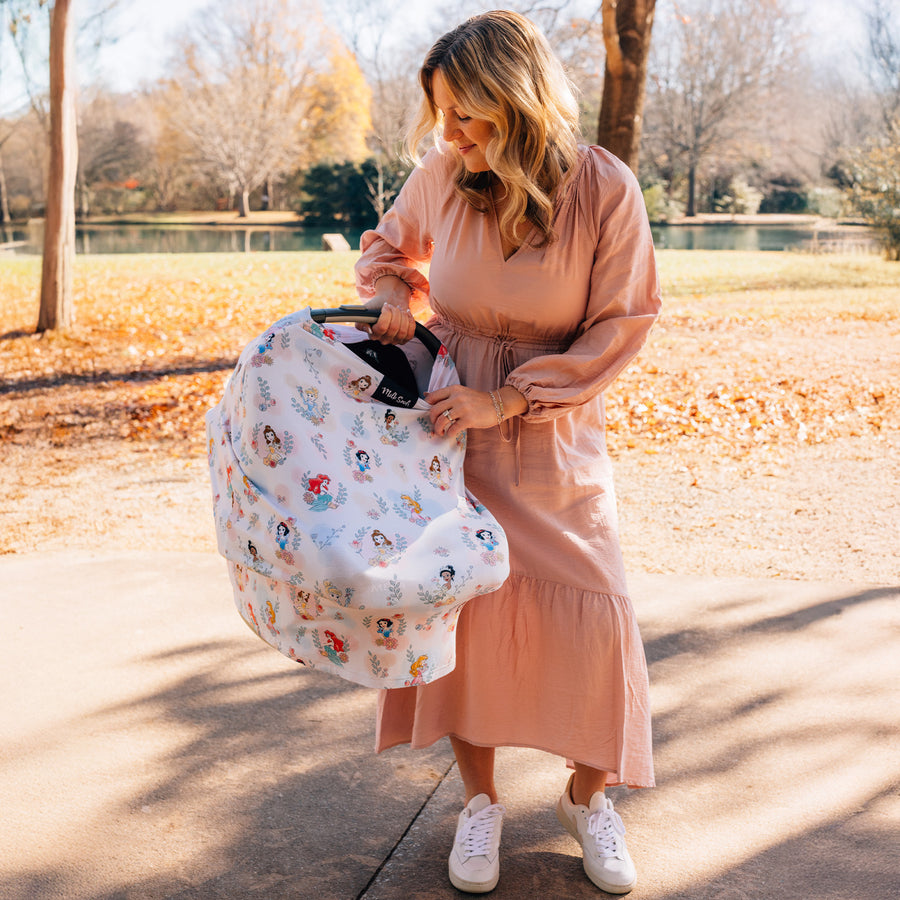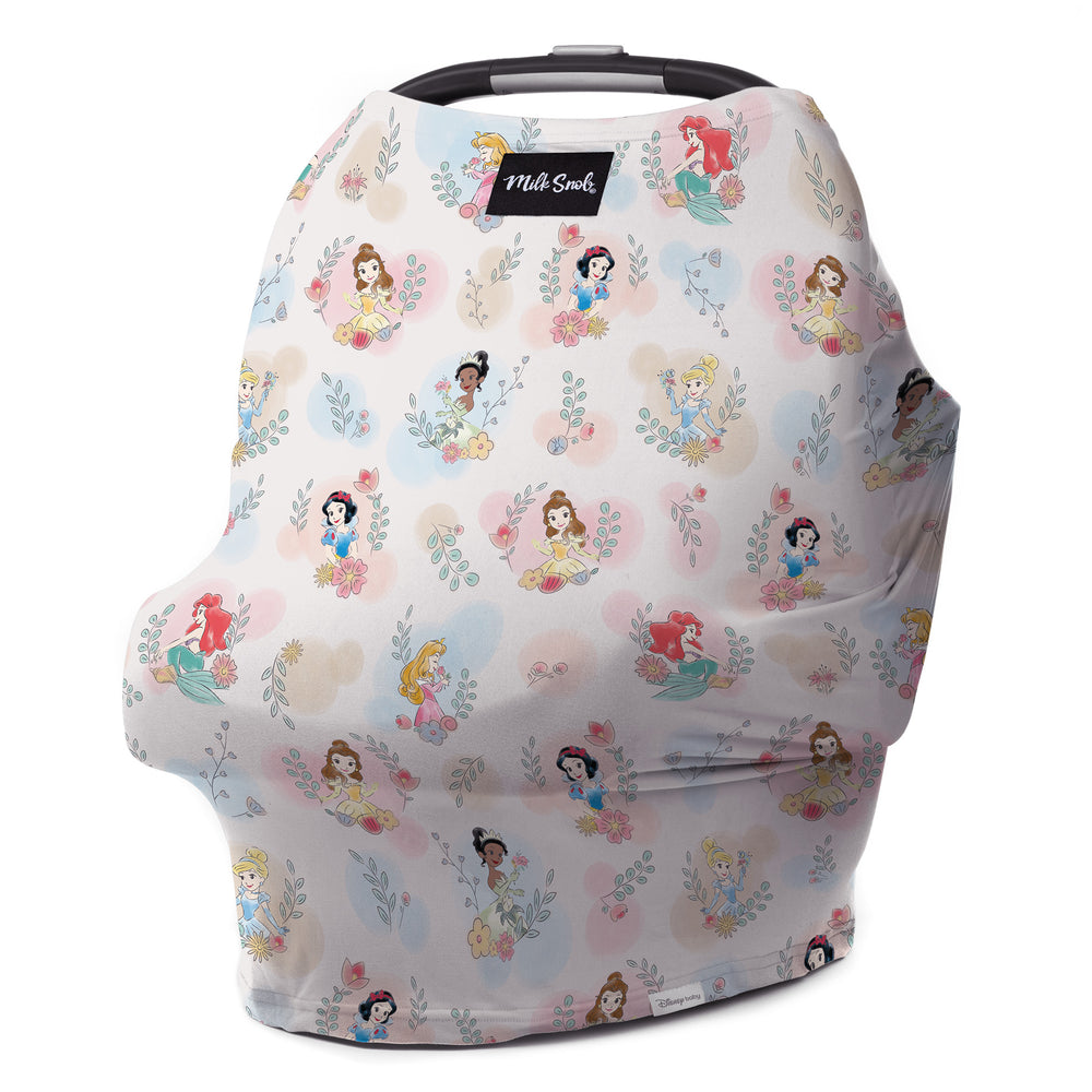 The original Disney Fairytale Friends 5-in-1 Milk Snob® Cover is a breathable multifunctional cover that can be used for car seats, nursing, shopping carts, high chairs, infant swings, and more.