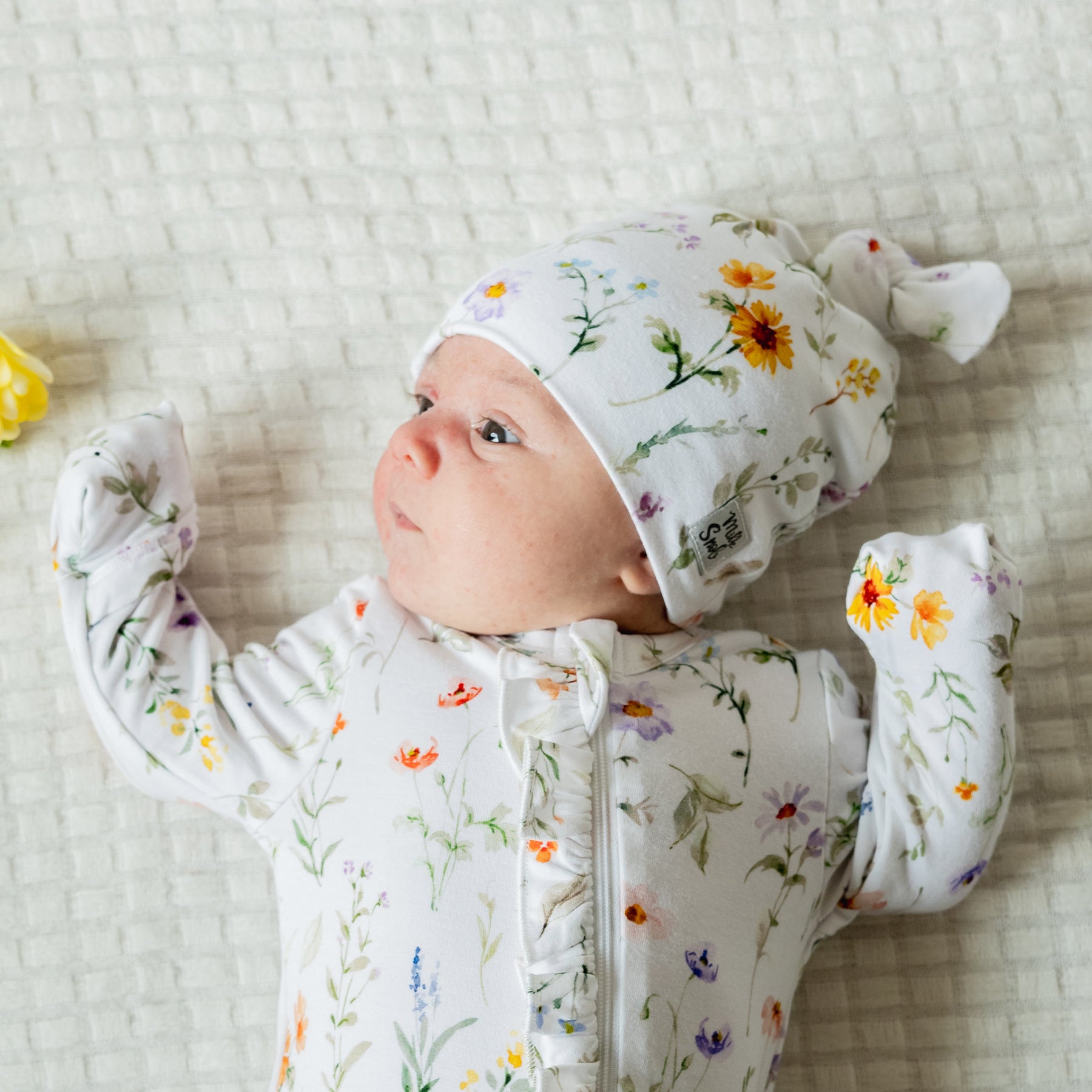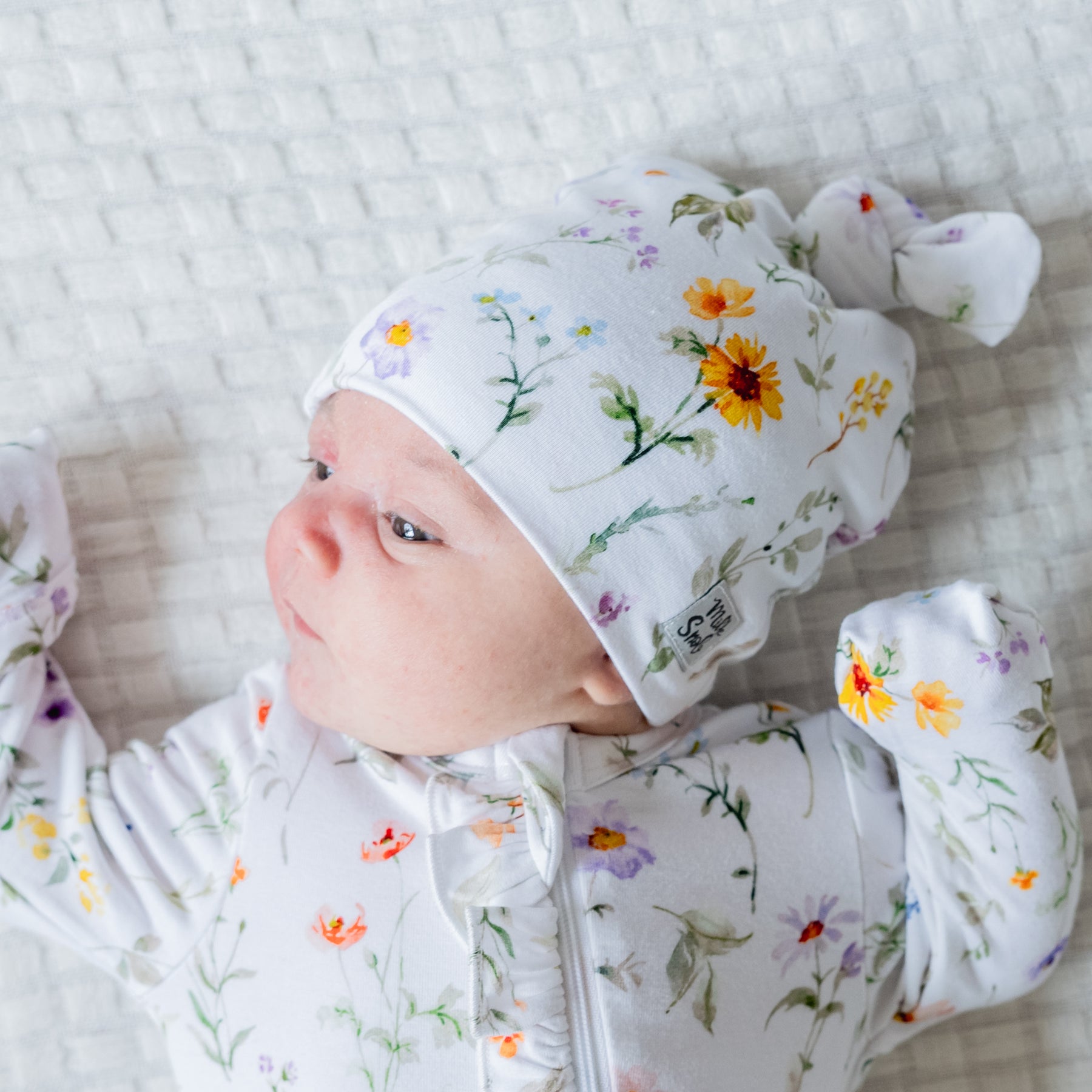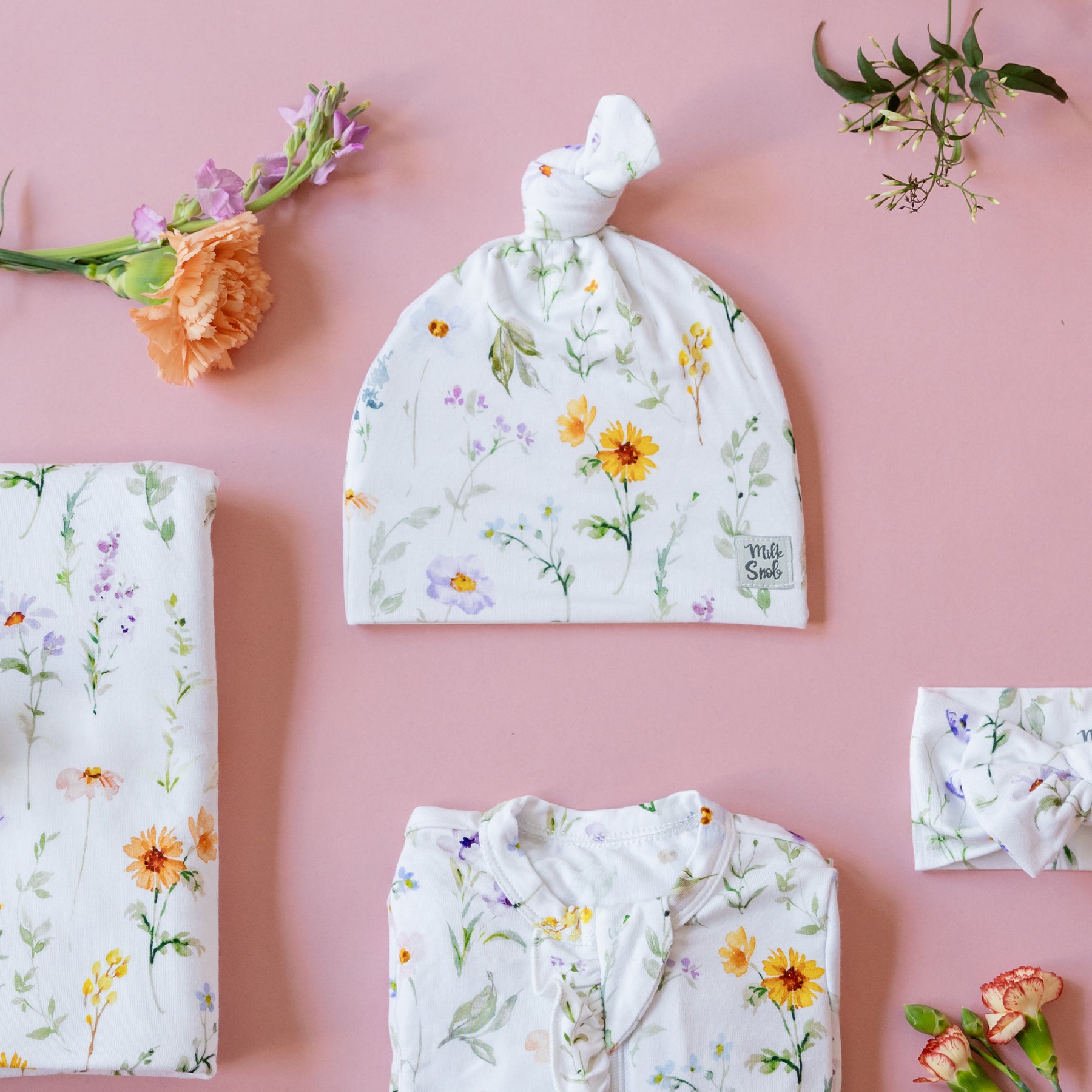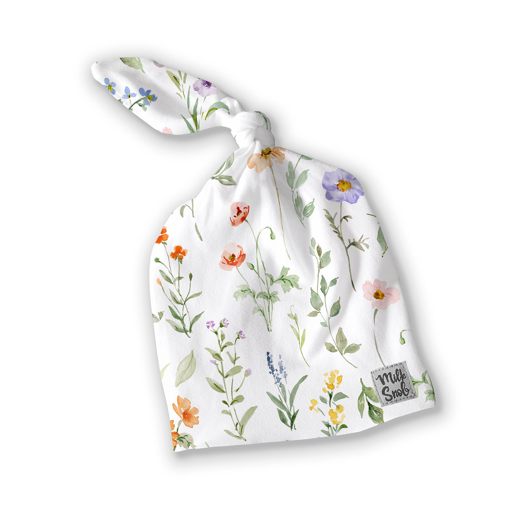 Cuddle up with Milk Snob's adorable knotted hats. As one of the first items you'll use to keep your newborn warm, our Eloise hat is a stylish staple that will keep your baby cozy in any climate. This design features soft watercolor spring florals on a white background.