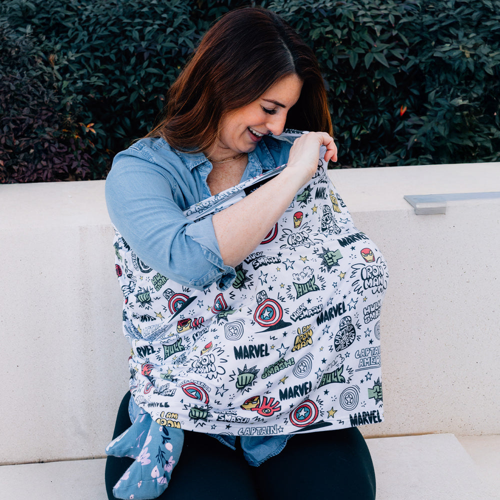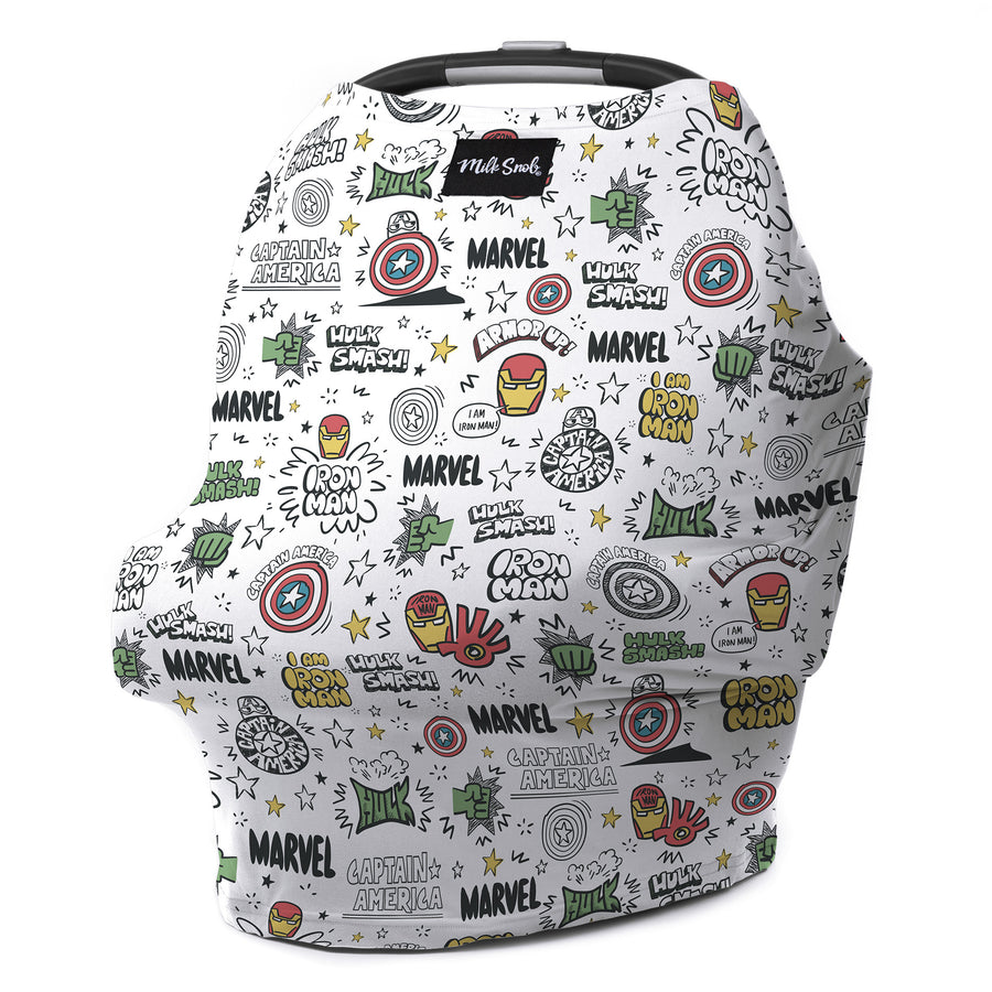 The original MARVEL Mighty Heroes Milk Snob 5-in-1 Cover is a breathable multifunctional cover that can be used for car seats, nursing, shopping carts, high chairs, infant swings, and more.